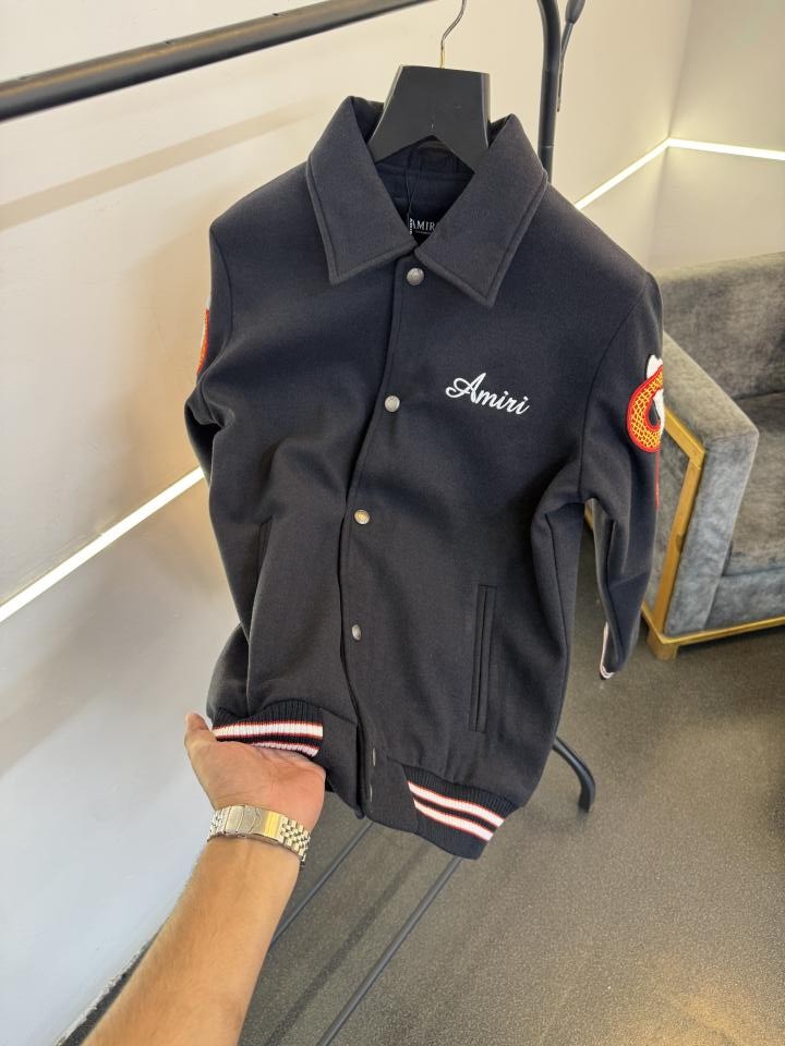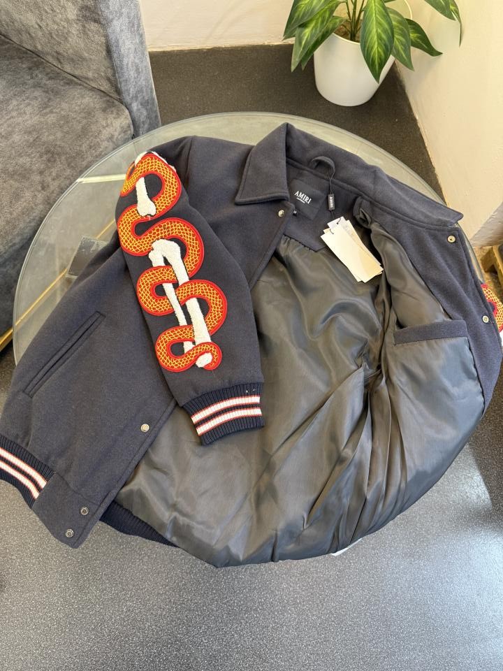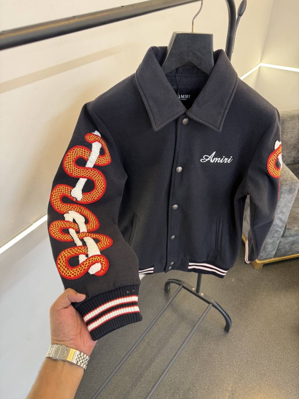 ? *shubmangill fame article amiri bone snake varsity jacket available with wool blend imported fabric with brand snap buttons and front embroidery brand on chest now in stock*?