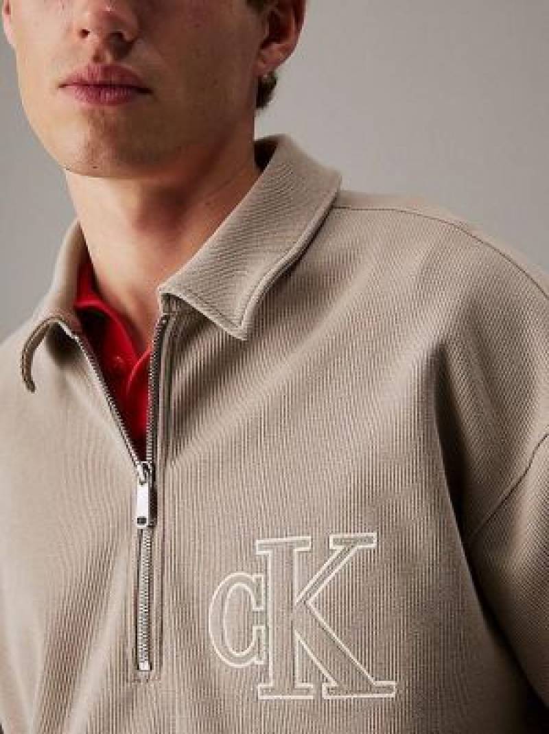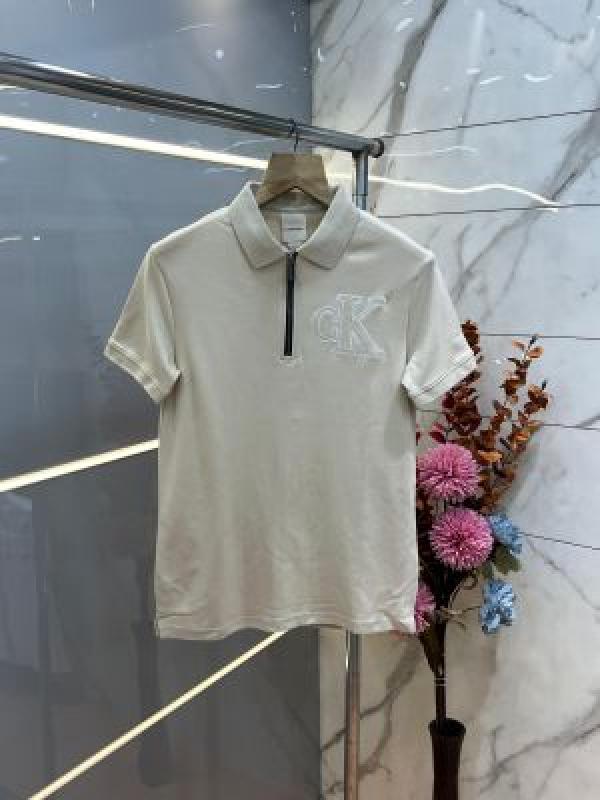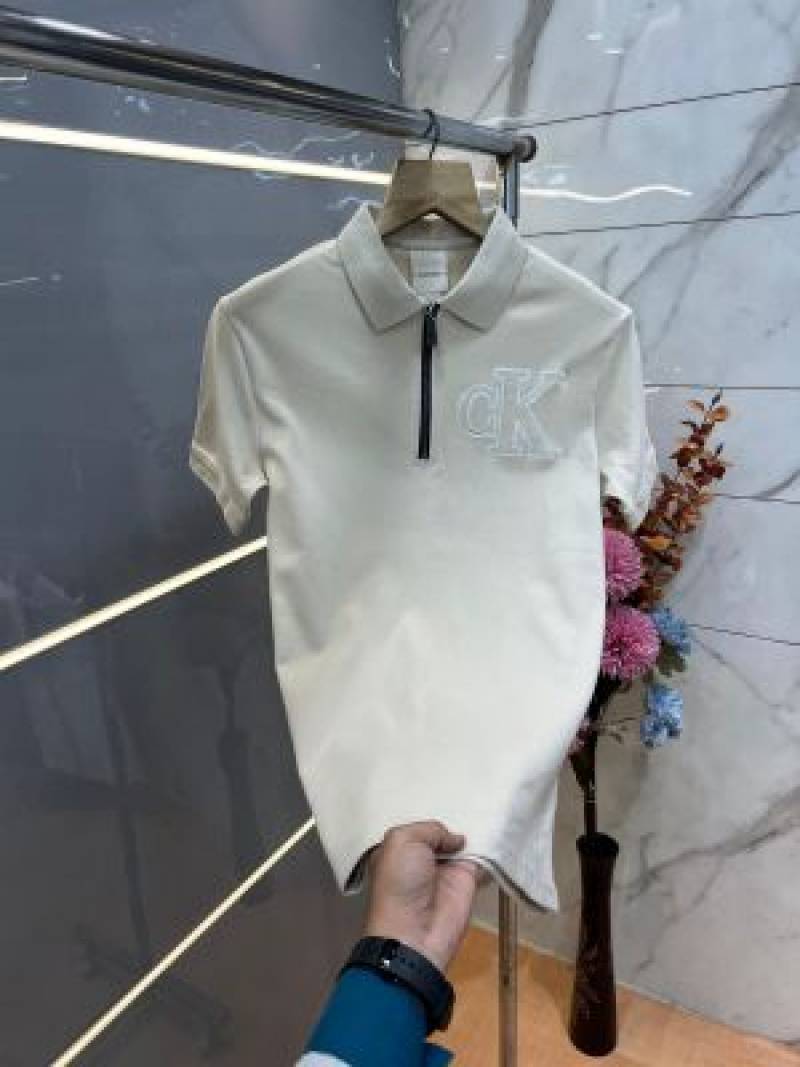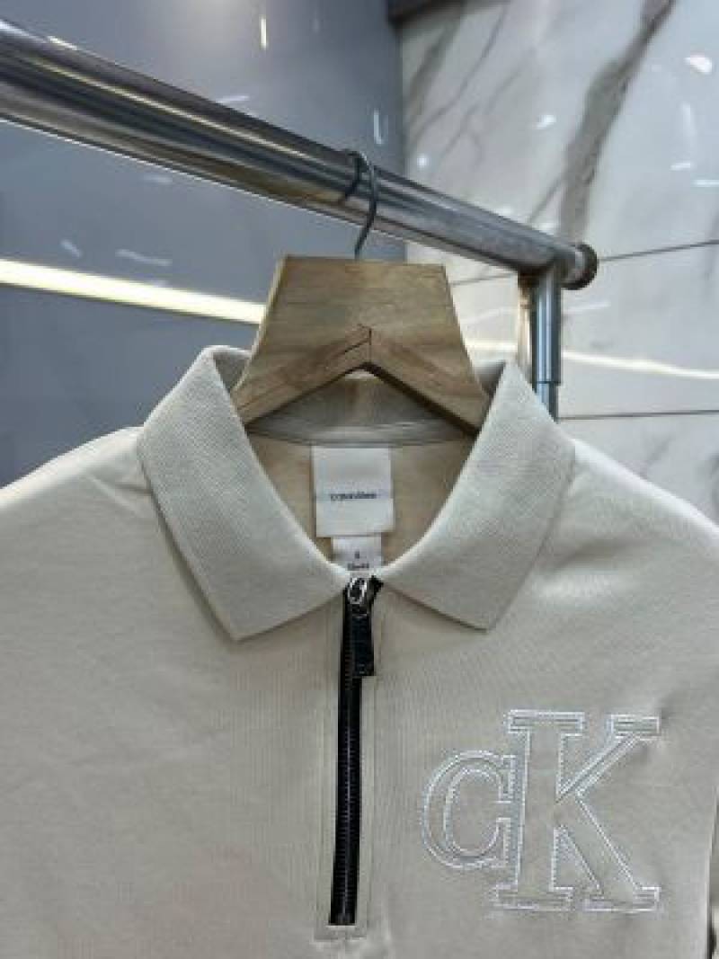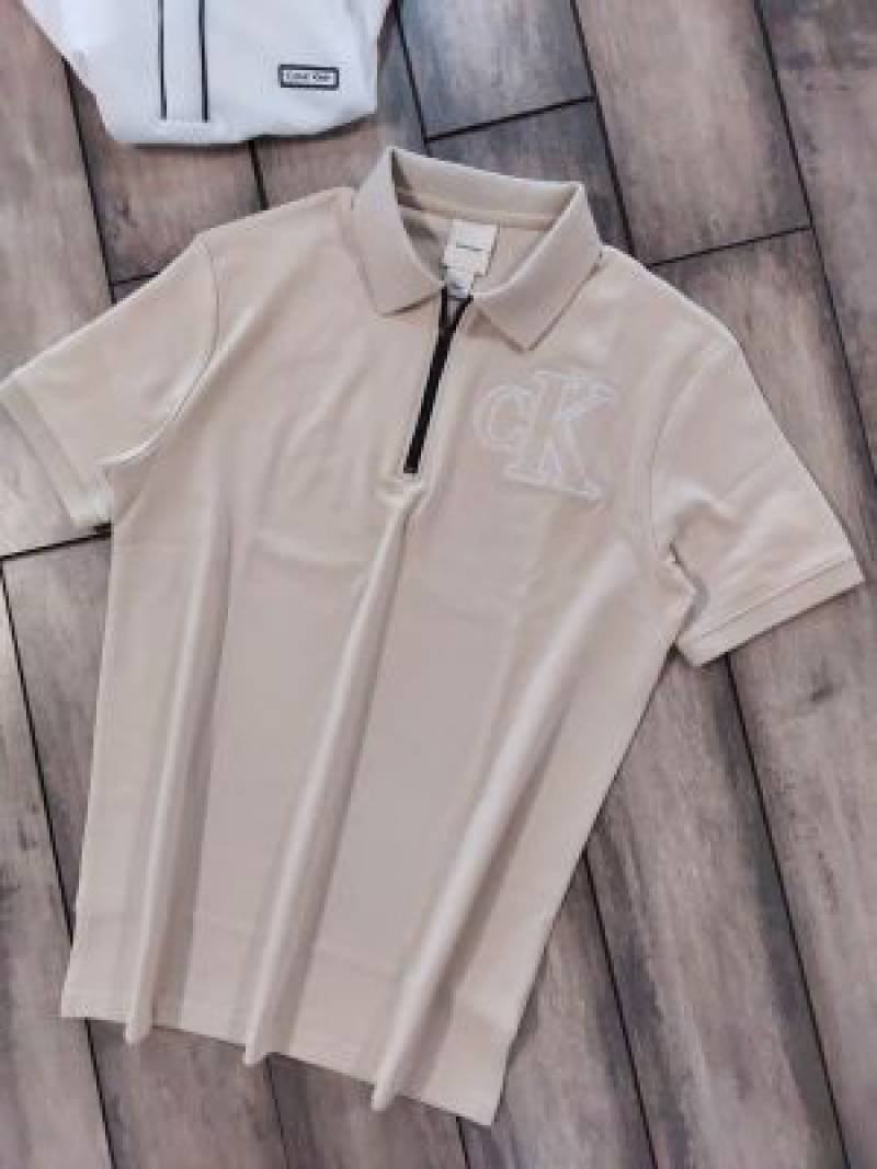Calvin Klei n Beige Premium Imported Compact Yarn 240 GSM Interlock Fabric Polo Tshirt with Embroidered Logo Zip Style 3925