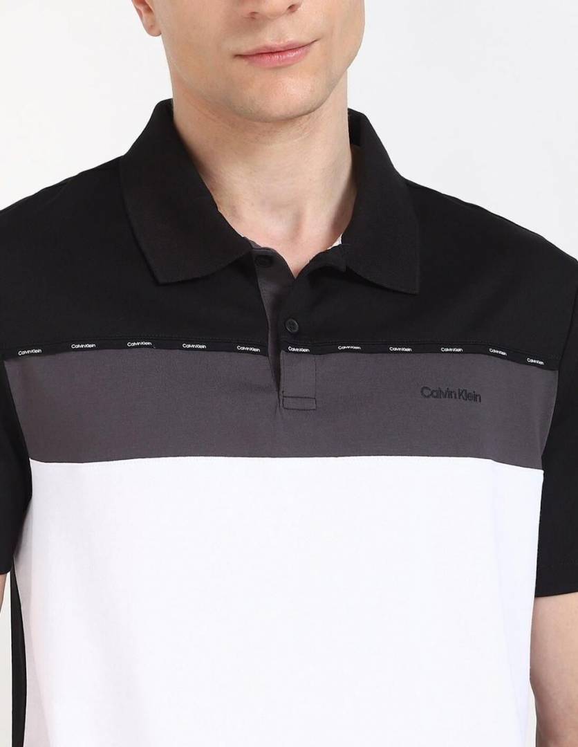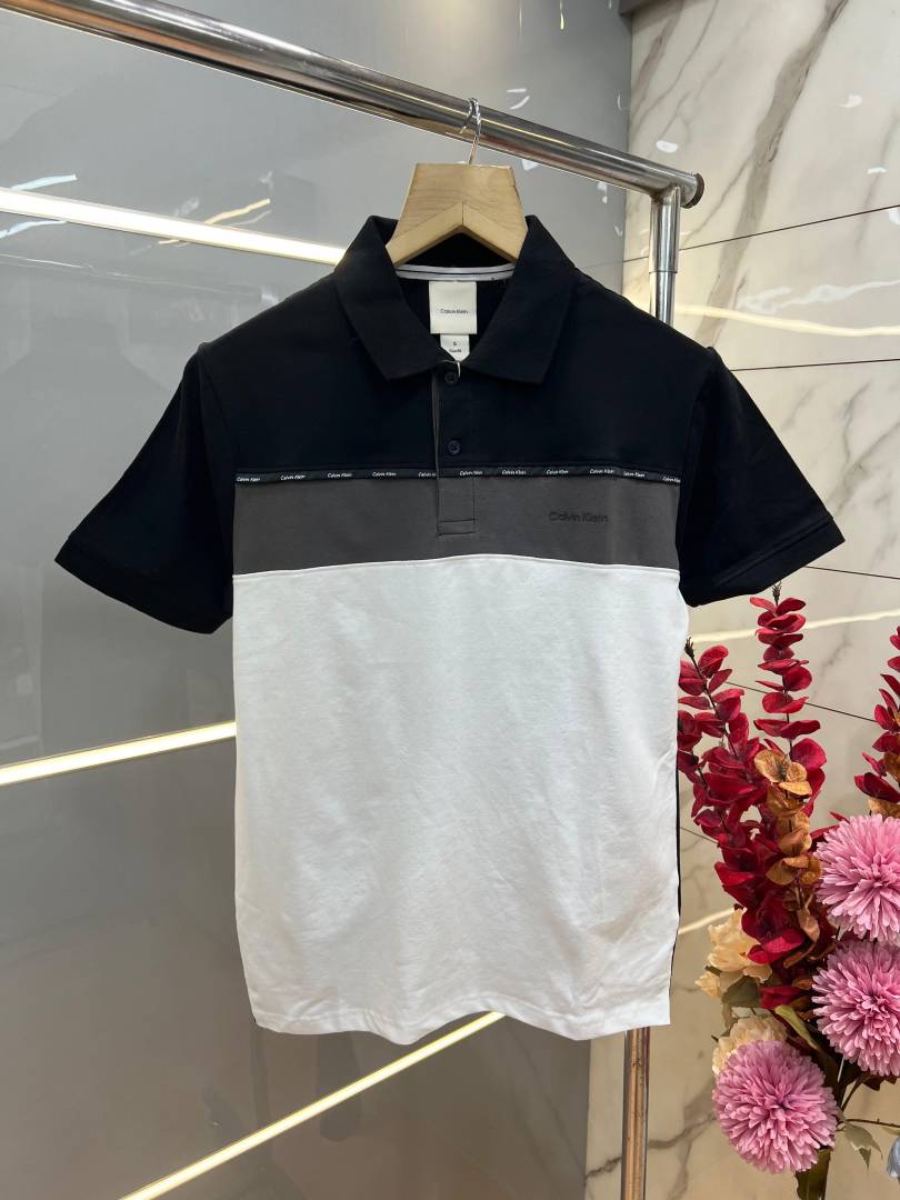 Calvin Klei n Black Premium Imported 240 GSM Interlock Lycra Fabric Polo Tshirt with Shoulder Design and Emboss Logo 4070