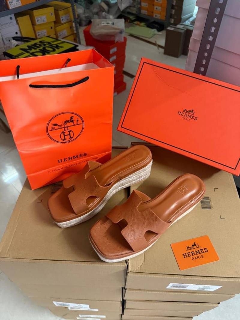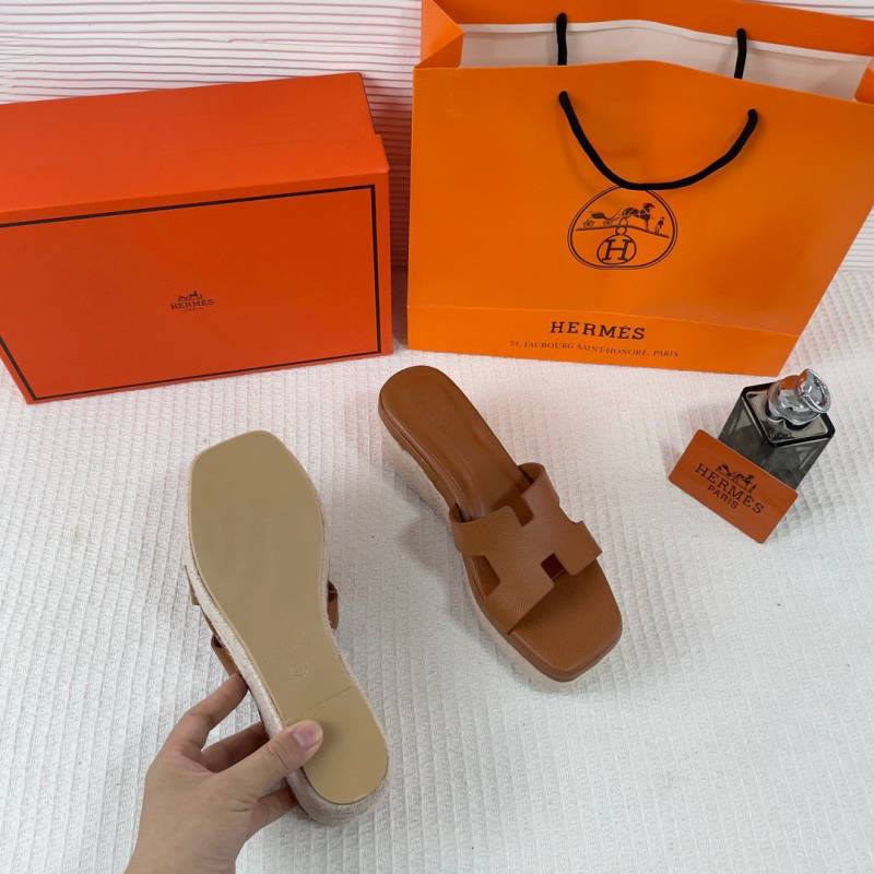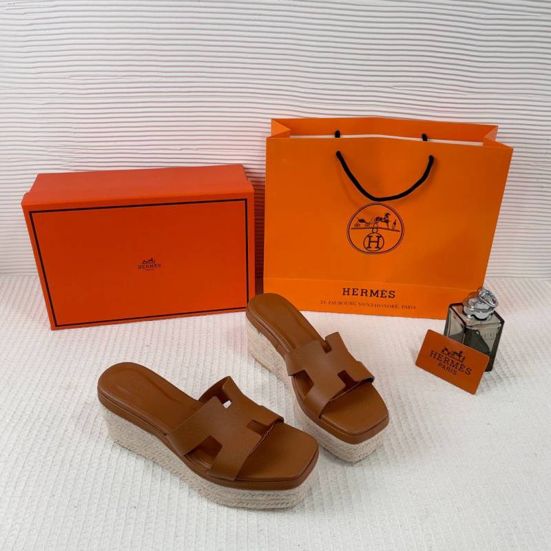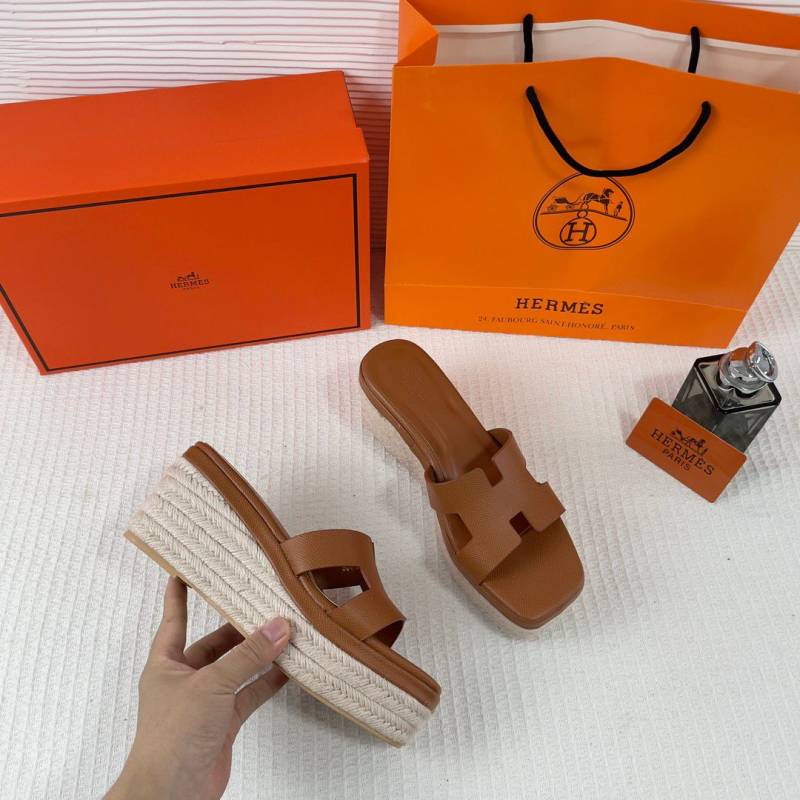 Hermes Brown Oran Wedge Platform Sandal Heel With OG Box & Carry Bag Brown Leather