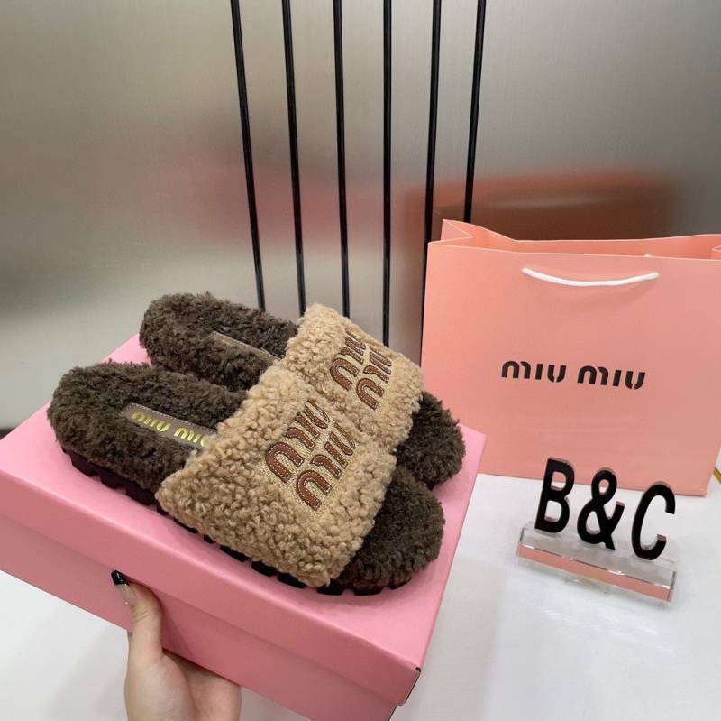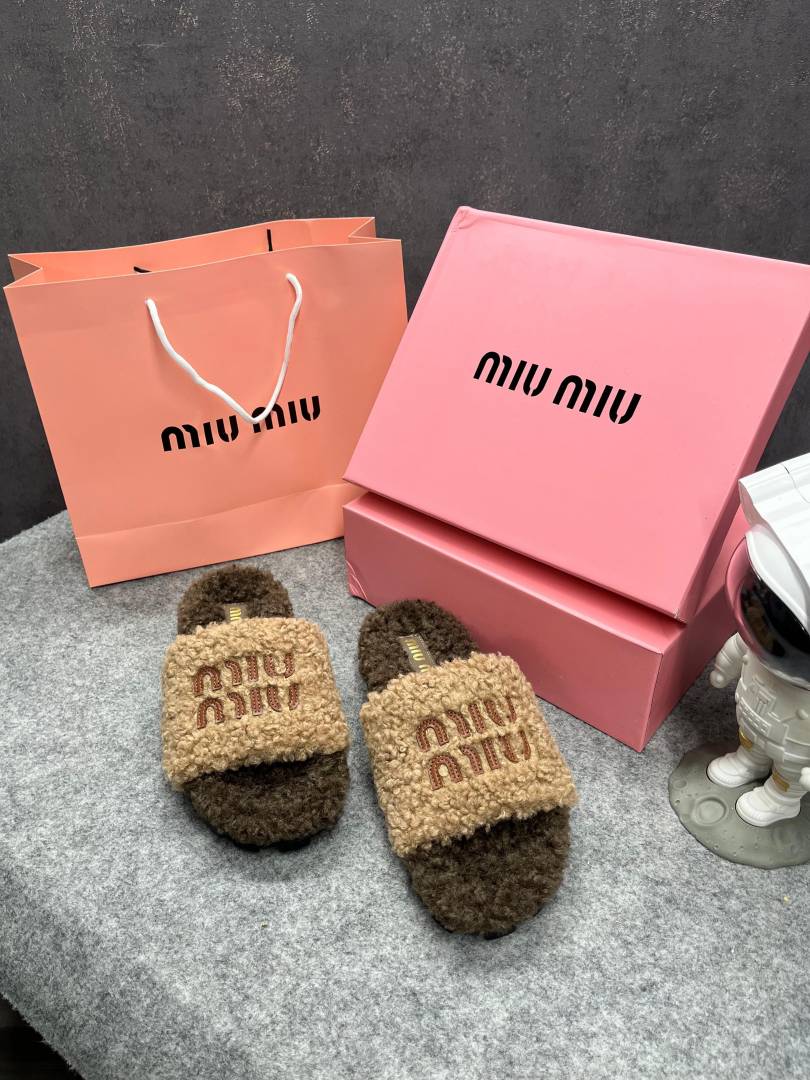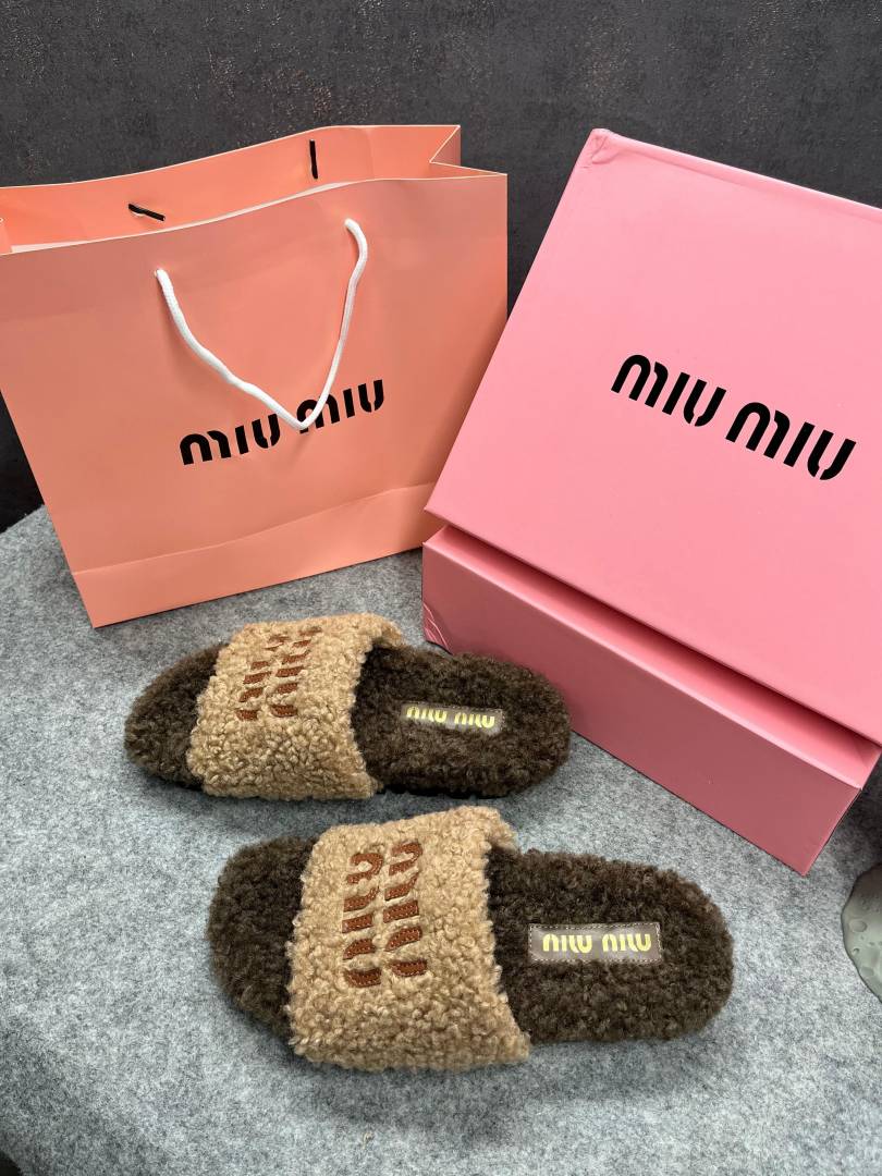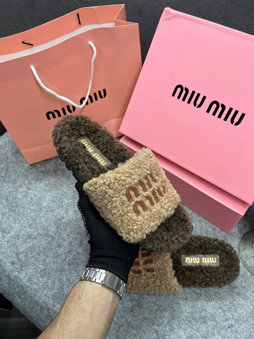 Miu Miu Fur Beige Brown Slippers For Her With OG Box Dust Bag & Carry Bag Beige Brown- 24D